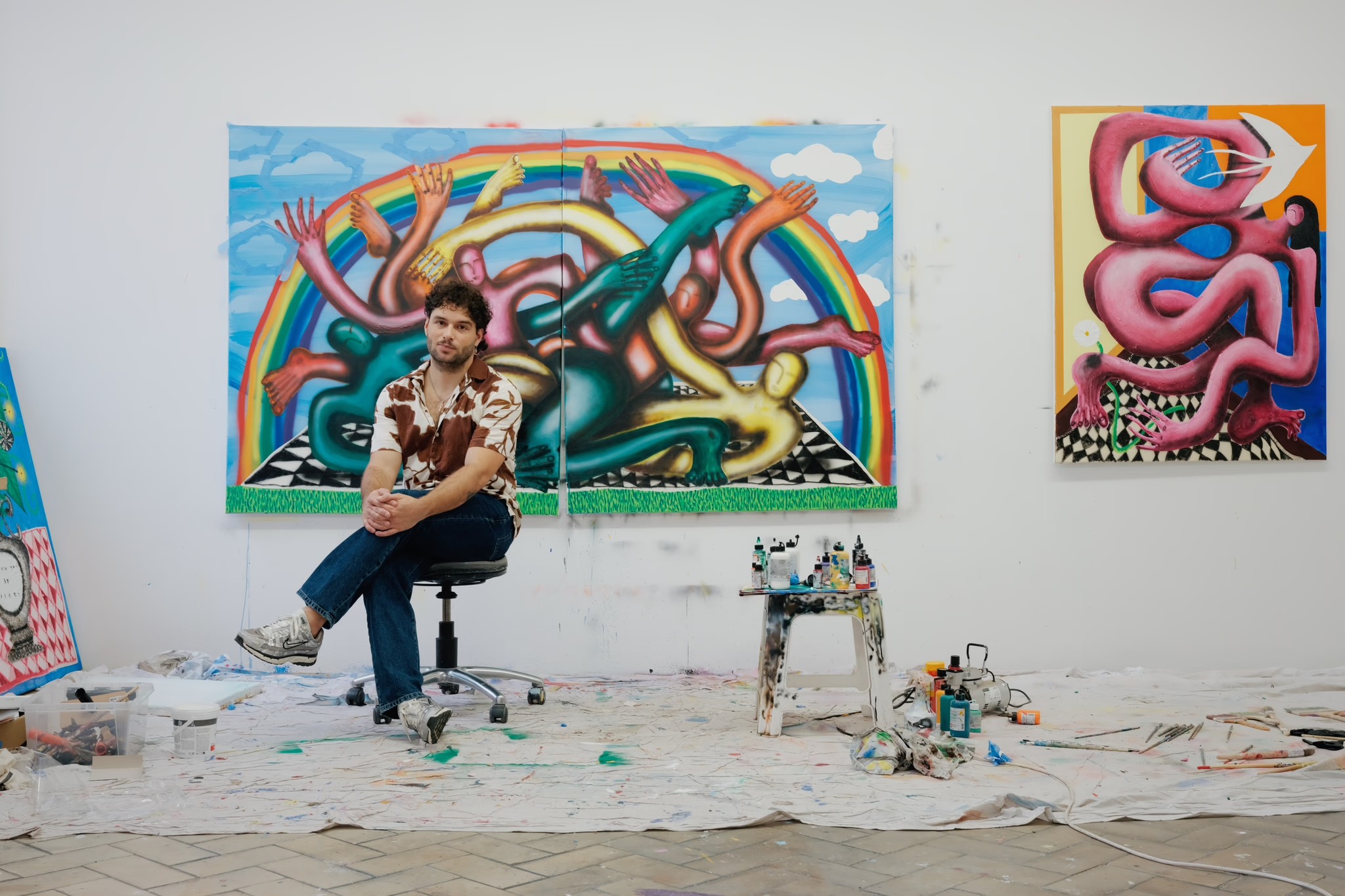 The techniques he uses interact with each other: airbrushing and digital drawing meet oil painting and other processes such as digital printing. This tension between materiality and virtuality places the artist's practice within a fundamentally hybrid aesthetic.